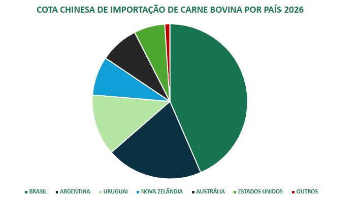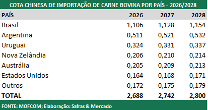 O quadro abaixo exprime a distribuição das cotas, apontando que os dois maiores fornecedores de carne bovina para a China foram os principais prejudicados. Apesar de o Brasil ter recebido a maior cota, 1,106 milhão de toneladas, esse volume parece insuficiente diante do potencial de exportação do país em 2026. A título de comparação no ano passado o Brasil embarcou 1,68 milhão de toneladas de carne bovina in natura para a China.