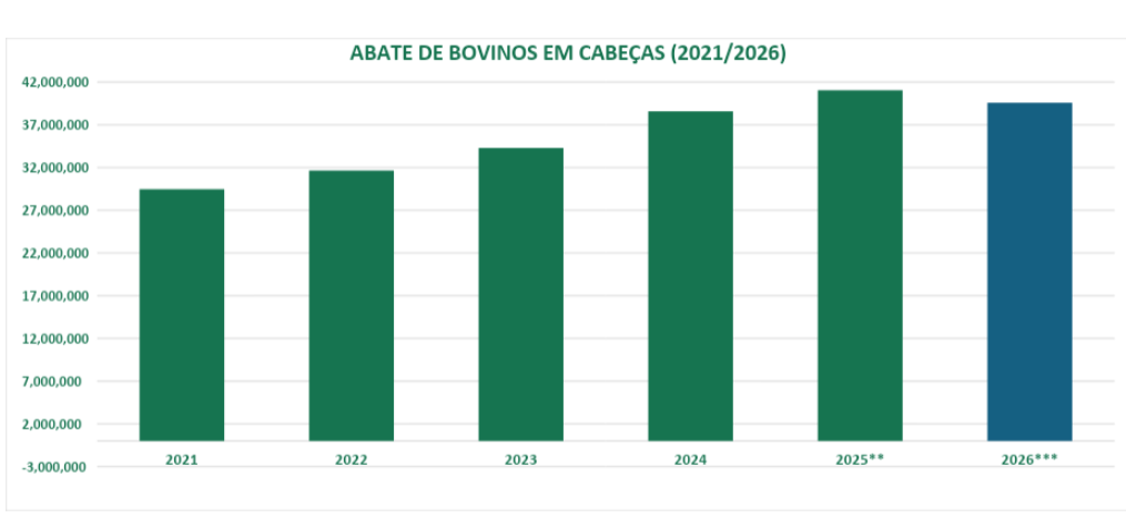 A expectativa é que sejam abatidos no Brasil em torno de 39,57 milhões de cabeças de gado, decréscimo de 3,6% na comparação com o ano de 2025, em que foram abatidos mais de 41 milhões de cabeças de gado.