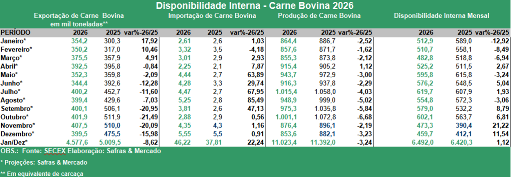 Para as exportações, a ausência chinesa será bastante sentida, com embarques estimados de aproximadamente 4,58 milhões de toneladas em equivalente carcaça, recuo de 8,6% na comparação com as exportações de mais de 5 milhões de toneladas em equivalente carcaça registradas em 2025. Com o atual ambiente delimitado, haverá um crescimento de 1,12% na oferta interna de carne bovina, aproximadamente 6,5 milhões de toneladas em equivalente carcaça.