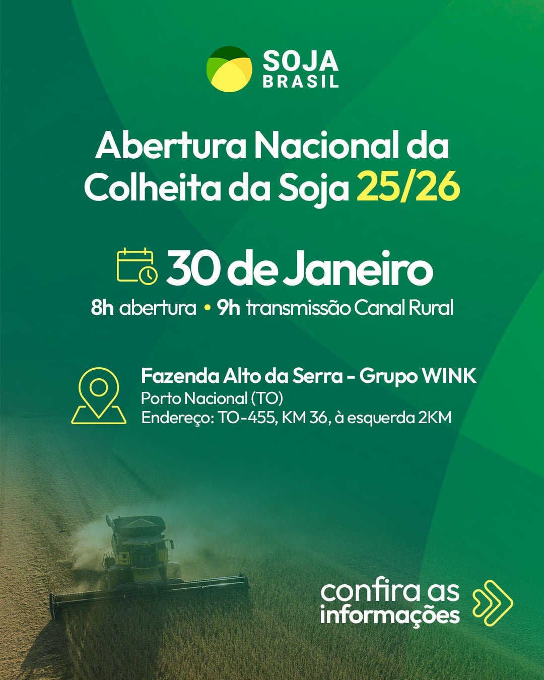 As inscrições para a Abertura Nacional da Colheita da Soja 2025/26 seguem abertas. Falta bem pouco para a cerimônia que marca oficialmente o início simbólico da colheita da principal cultura agrícola do país, que será realizada no dia 30 de janeiro de 2026, a partir das 8h.