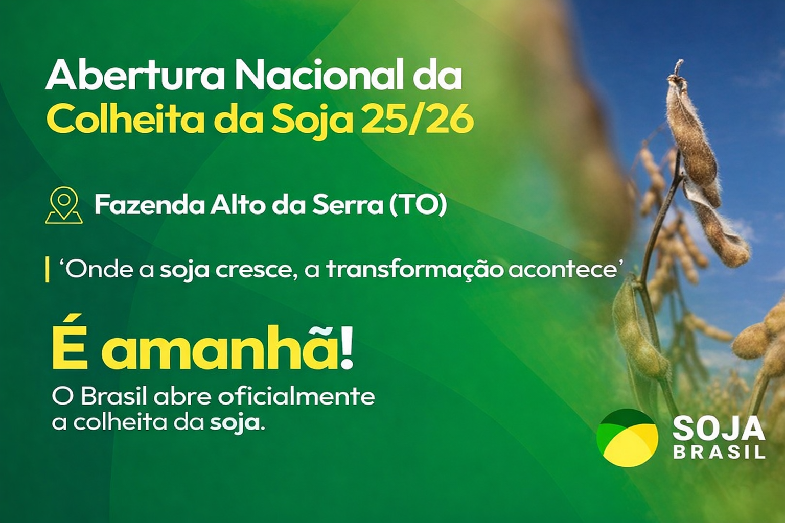 É amanhã: a Abertura Nacional da Colheita da Soja 2025/26 a partir das 9h será realizada no dia 30 de janeiro de 2026, com a transmissão a partir das 9h, na Fazenda Alto da Serra, do Grupo Wink, em Porto Nacional (TO). O evento marca simbolicamente o início da colheita da soja no país e deve reunir produtores rurais, lideranças do setor, especialistas e autoridades do agronegócio brasileiro.